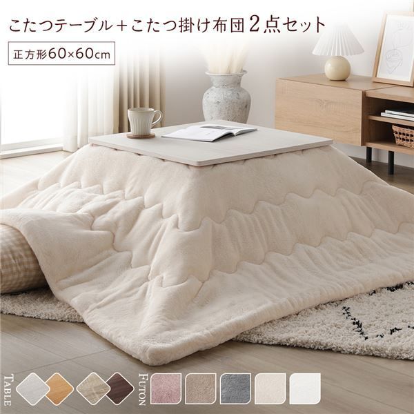こたつ セット 2点セット 〔 こたつテーブル 約60×60cm ホワイトウォッシュ|ナチュラル こたつ布団 約170×170cm アイボリー 〕 正方形 折りたたみ リバーシブル天板 ローテーブル 折りたたみテーブル こたつ掛け布団 こたつ掛布団 洗える ウ