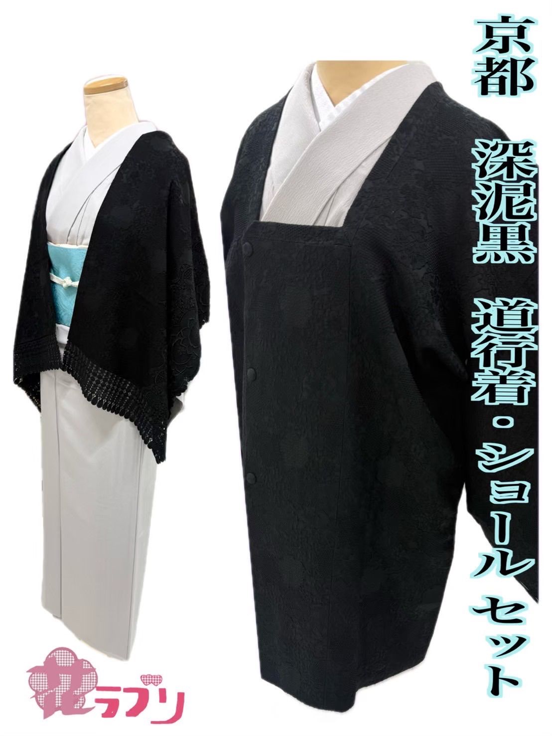 NMKS1011BK ≪花ラブリ» リユース♥ リサイクル 特選別織コート 羽織物 道行 ショール2点セット 伝承 五倍子黒 京都 深泥黒 黒 ブラック系 漆黒 レース 雪輪 花 レディース 和装 和柄 和風 和服