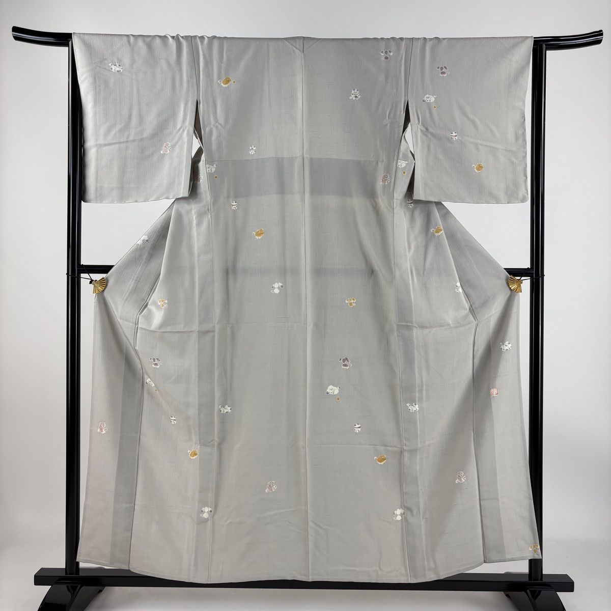 小紋 身丈156.5cm 裄丈64cm M 単衣 奇翠 青柳 赤城紬地 やまと 落款 証紙 犬 猫 絞り 灰色 正絹