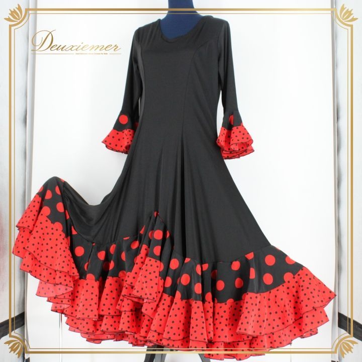フラメンコ 衣装 ワンピース ドレス 黒 赤 ドット 水玉 ボランテ フリル fantastica ブラック系 レッド系 ダンス 舞台 パーティ 発表会 レッスン 伸縮 スカート フリルデザイン ゴージャス 伸びる素材 快適 着やすい コスチューム レディース