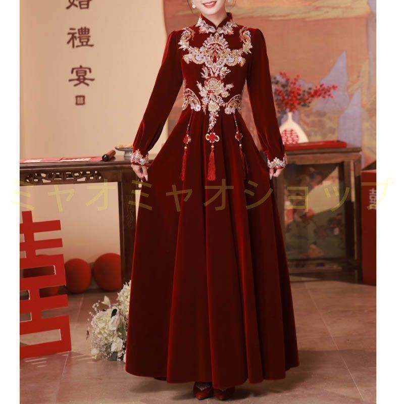 チャイナドレス 赤 ハイネック ロングドレス イブニングドレス 長袖 ベルベット 発表会ドレス Aライン パーティードレス ワイン赤 ゴールド刺繍 結婚式ドレス 二次会 1214