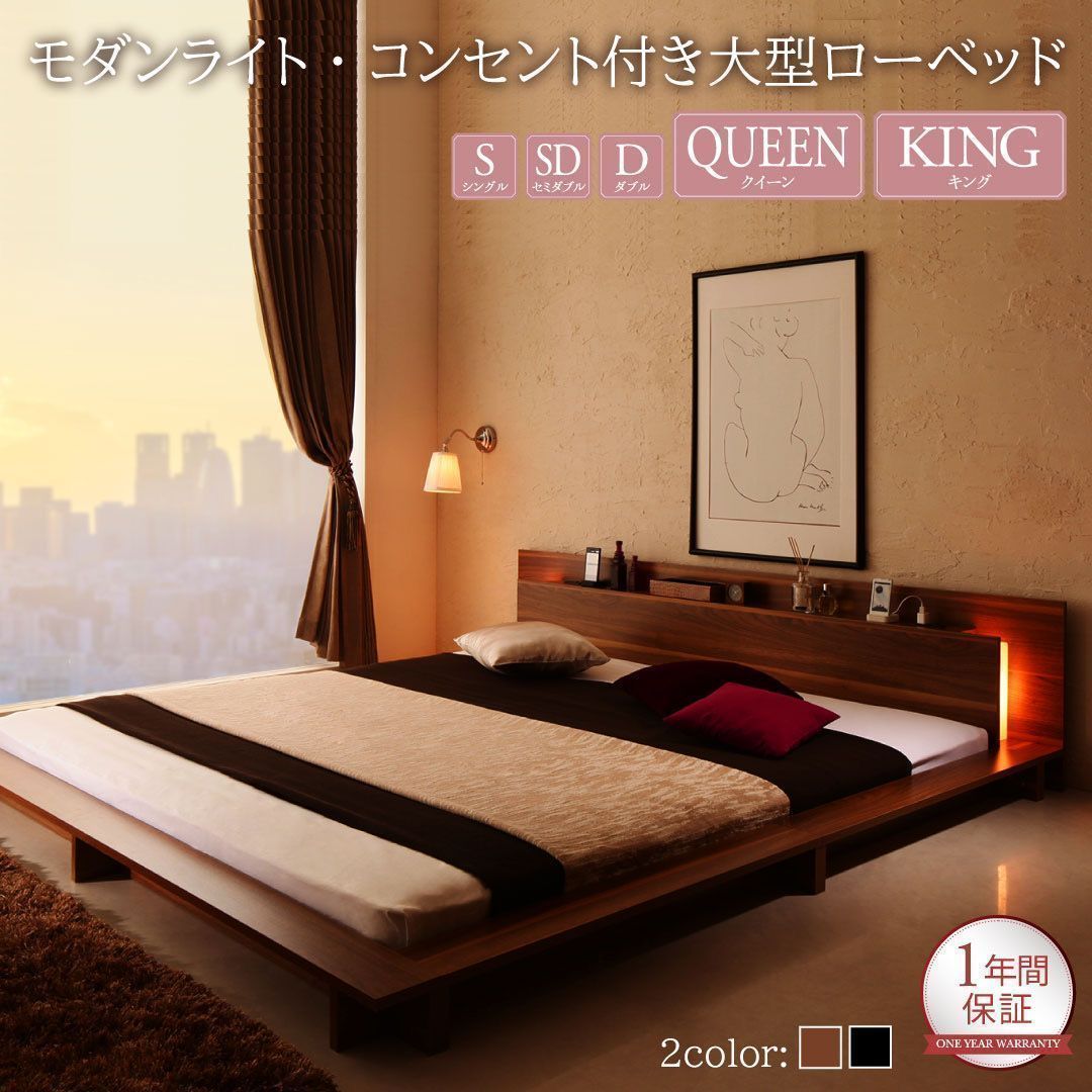 モダンライト コンセント付き大型ローベッド ベッドフレームのみ クイーン 組立設置サービス付き