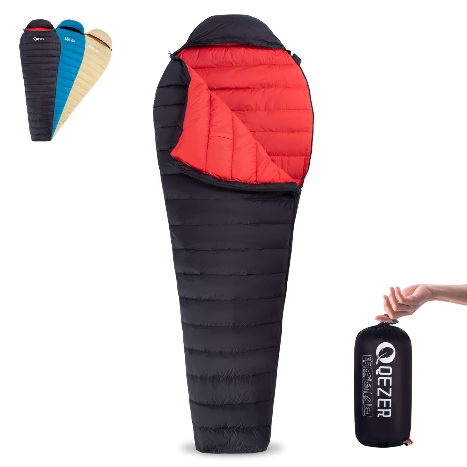 QEZER シュラフ ダウン 寝袋 コンパクト マミー型 1200gダウン充填 冬用寝袋 260g|400gダウン充填 春夏秋用 600FP ダウン 400T撥水加工 2人用に連結 アウトドア キャンプ 登山 車中泊 防災用