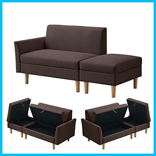 ソファベッド 1人用にも レイアウト自由 かんたん組立 ローソファ 片肘デザイン 左右対応 ブラウン オットマン付き 幅90cm カウチソファ 収納付き 2人掛けソファ