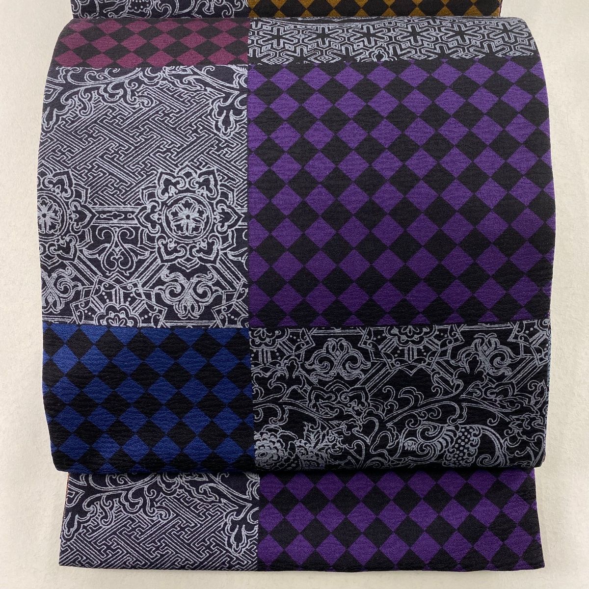 袋帯 前田仁仙 落款 やまと 市松 草花 黒 全通 正絹