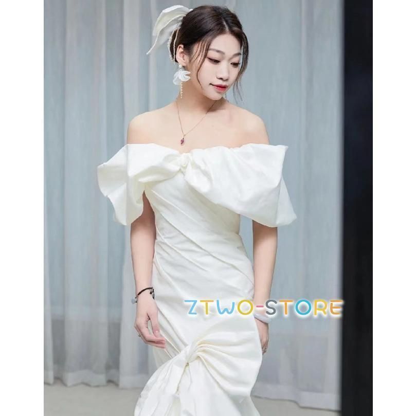 ウエディングドレス マーメイド トレーン ウェディングドレス 袖あり オフショルダー ドレス ロングドレス マキシ丈 リボン 大きいサイズ 小さいサイズ 白0218CYB88 登場