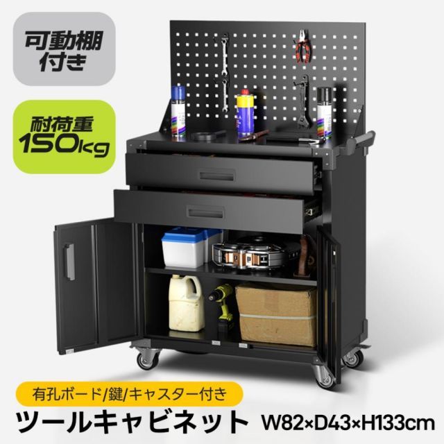 ツールキャビネット ツールワゴン ツールカート ロールキャビネット スチール 工具箱 ローラーキャビネット スリム 2段引き出し 有孔ボード付き 鍵付き