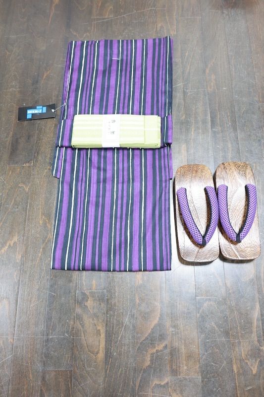 男浴衣3点セット 紫 黒 ベージュ ヨロケ縞 008400