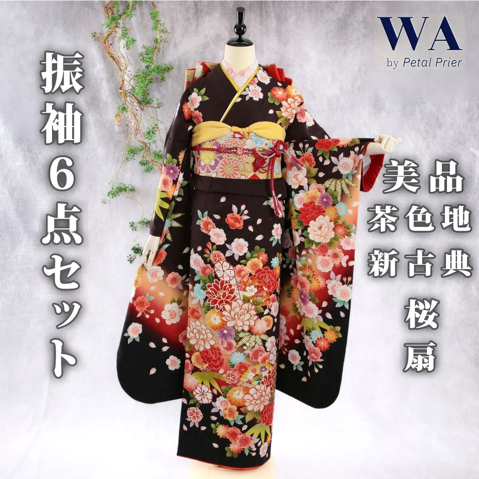 振袖フルセット 振袖セット 振袖 訳あり Lサイズ 茶×新古典 成人式 着物 晴れ着 6点セット FNO-433