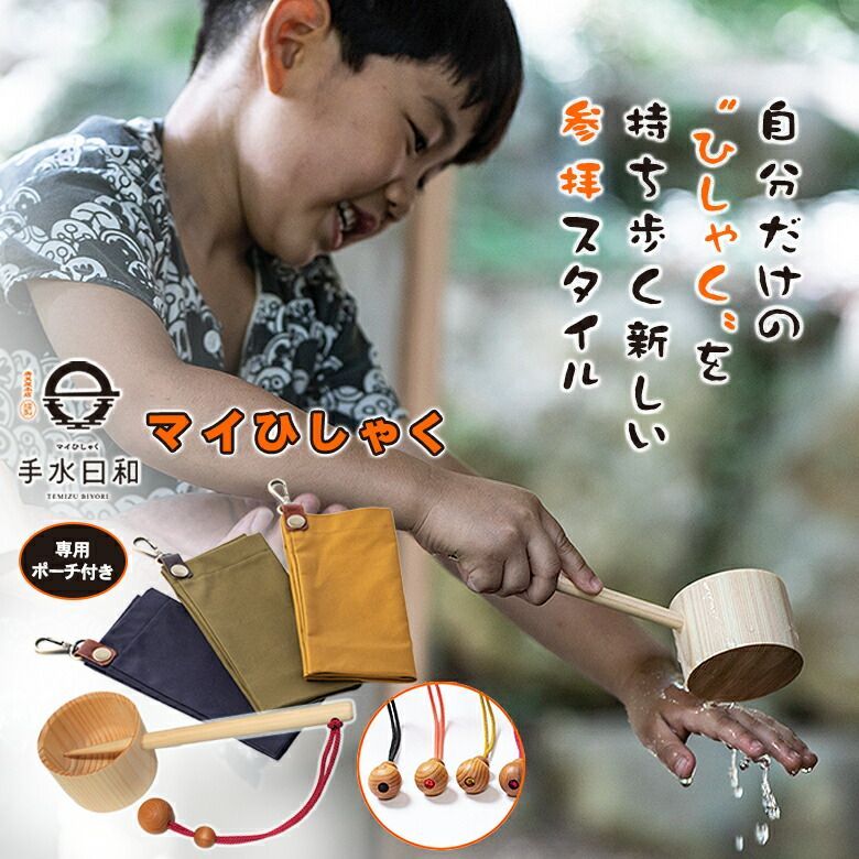 マイひしゃく 手水日和 選べる ポーチ付き ストラップ 柄杓 水杓 ひしゃく 21cm 持ち運び コンパクト 軽量 マイ柄杓 桧 ひのき 手水