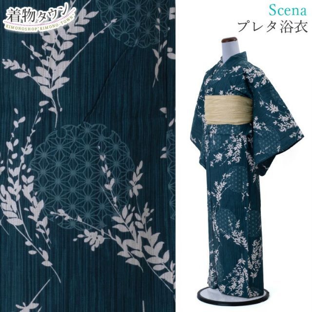 浴衣 レディース 女性用 Scena 青緑 紺 ブルーグリーン ネイビー 綿 麻 夏 夏着物 夏小紋 花柄 ゆかた 仕立て上がり 洗える プレタ 販売 単品 yukata-00083