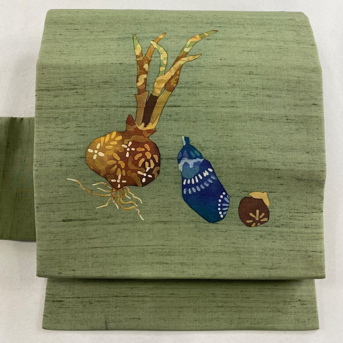 名古屋帯 秀品 紬地 生り物 よもぎ色 正絹