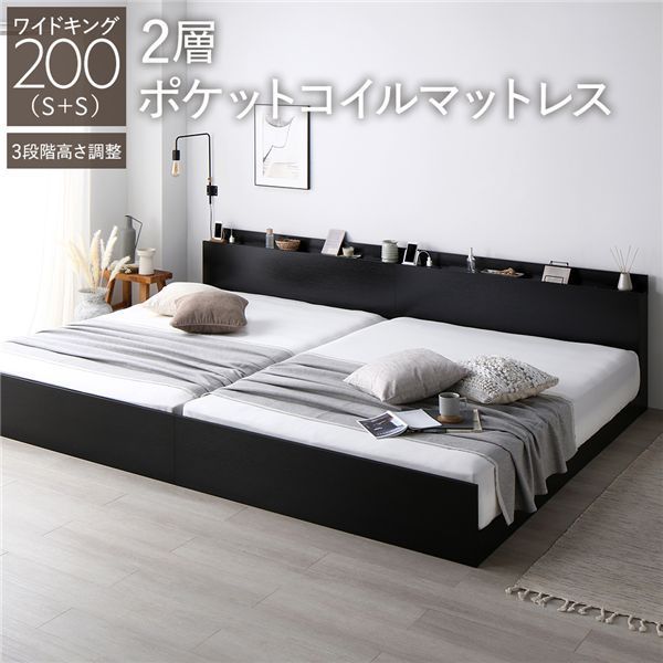 ベッド ワイドキング 200 S S 2層ポケットコイルマットレス付き ブラック 連結 3段階 高さ調整可 棚付き 宮付き 宮棚付き 2口 コンセント付き 連結ベッド すのこベッド すのこ ベット ローベッド フロアベッド Asteria アステリア ワイド