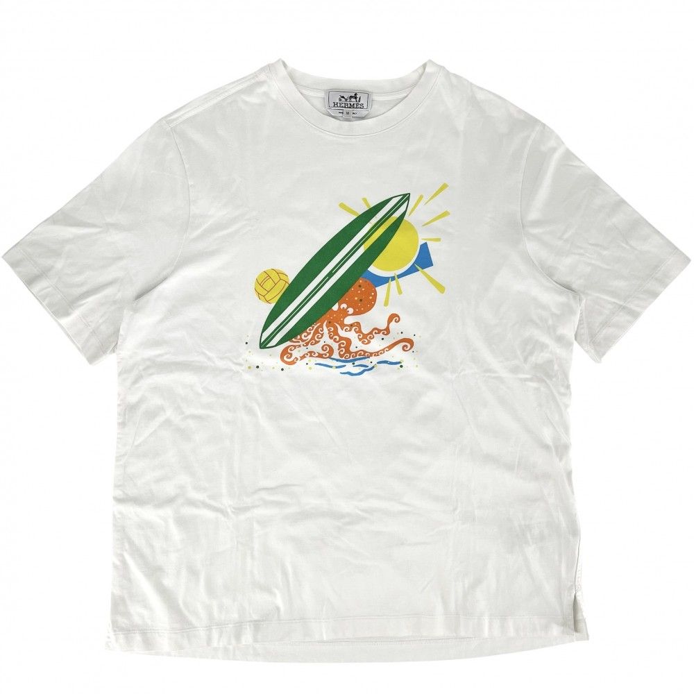 エルメス 半袖Tシャツ レディース プールウォッチ クルーネック トップス サーフィン タコ 太陽 アパレル 服 HERMES M ホワイト 白 マルチカラー コットン 春 夏 品
